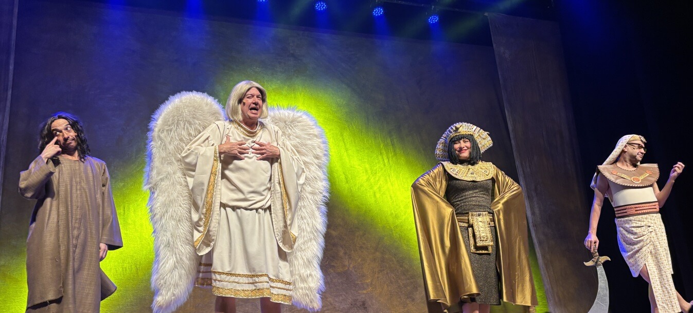 Reprisando a peça criada em 1995 e lançada em DVD em 2009, o grupo de seis atores se revezou em dezenas de personagens. Com o elenco formado por Adriana Nunes, Adriano Siri, Jovane Nunes, Ricardo Pipo, Victor Leal e Welder Rodrigues, se encontram no palco o romano e o egípcio, um anjo, Jesus e o diabo.