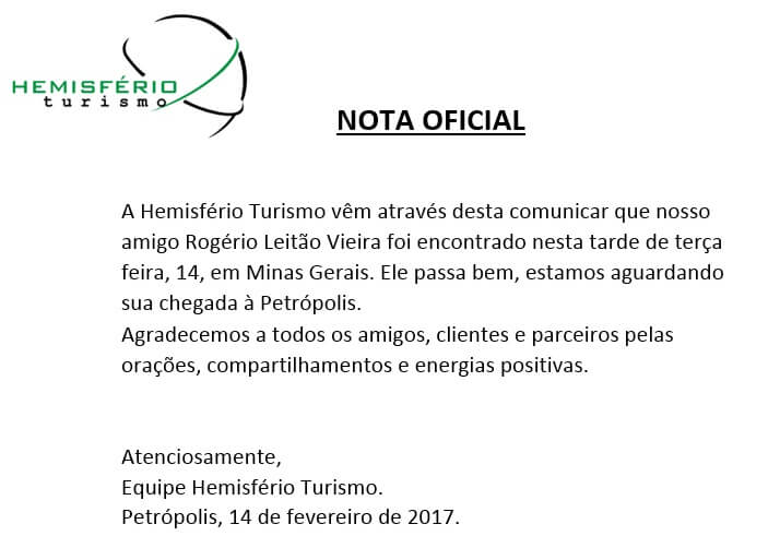 Rogério Leitão de Vieira, de 39 anos, que estava desaparecido desde o dia 6 de fevereiro foi localizado nesta terça (14), em Minas Gerais. Segundo nota oficial enviada pela Hemisfério Turismo, ele passa bem.
