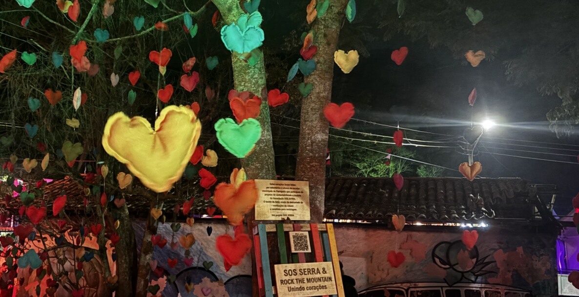Duas árvores cheias de corações se destacam na entrada do Rock The Mountain, no Parque de Itaipava. Os corações foram feitos por voluntários e alunos das escolas municipais de Petrópolis que participam de projetos de sustentabilidade e história da Associação SOS Serra. O tecido de linho usado foi descartado de confecções da cidade e recolhido para reciclagem.